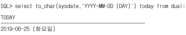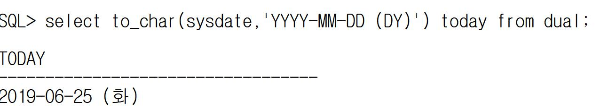 | YYYY-MM-DD (DY) | 요일명을 줄여서 출력 DY : 요일명을 줄여서 출력 [출력형태] 2019-06-25 (화) |