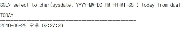 | PM HH:MI:SS | 오전, 오후를 함께 출력 [출력형태] 오후 02:27:30 |