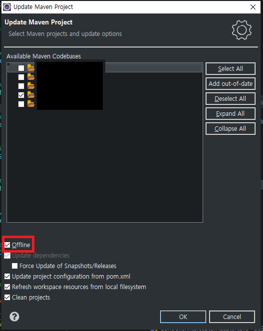 오프라인으로 구성할 프로젝트 우클릭 -> maven -> update project에서 offline 체크