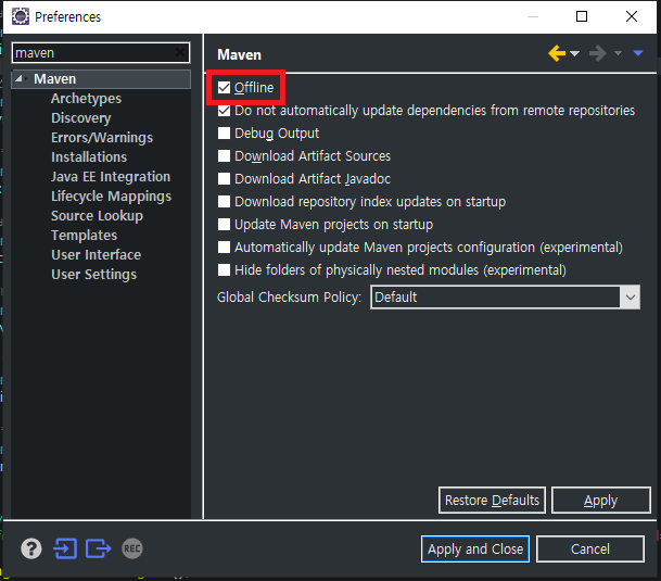 이클립스 Preferences - Maven에서 Offline을 체크해준다.