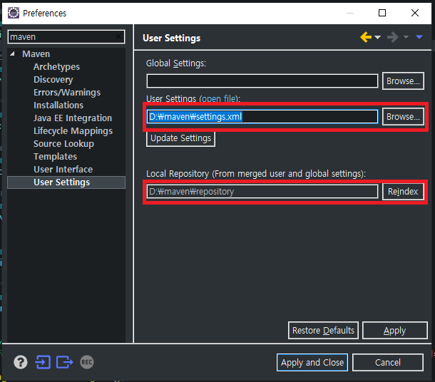 설정파일 경로와 maven저장소 경로를 지정한다.