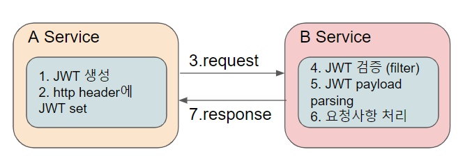 A가 보낸 요청을 B가 가장 먼저 받아보는 곳은 Filter이다. 그래서 JwtFilter라는 것을 만들어서 JWT로 들어온 요청에 대한 검증과 payload에 담긴 값을 꺼내어 request에 담는 역할을 한다. 이해를 돕기 위해 만든거라 JWT 외의 기능은 건성건성 만들었으니 오류에 대한 처리 부분을 비롯해 나머지 부분은 각자 완성하도록 하자.