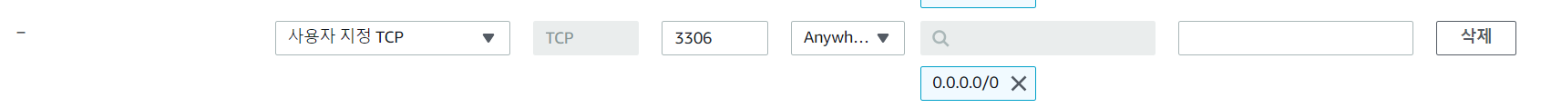 - 인바운드 규칙 설정에 > 사용자 지정 TCP IP > 3306 포트 > 위치 무관으로 설정