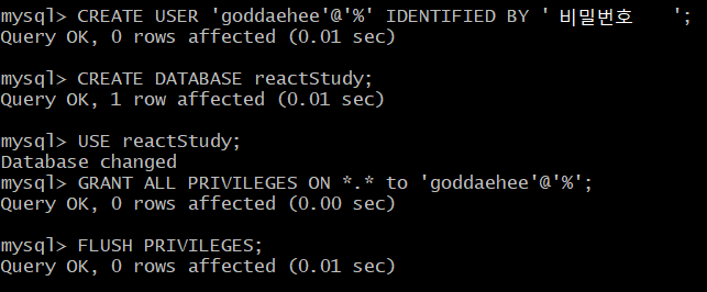 CREATE USER '아이디'@'로컬/외부 접속' IDENTIFIED BY '비밀번호';