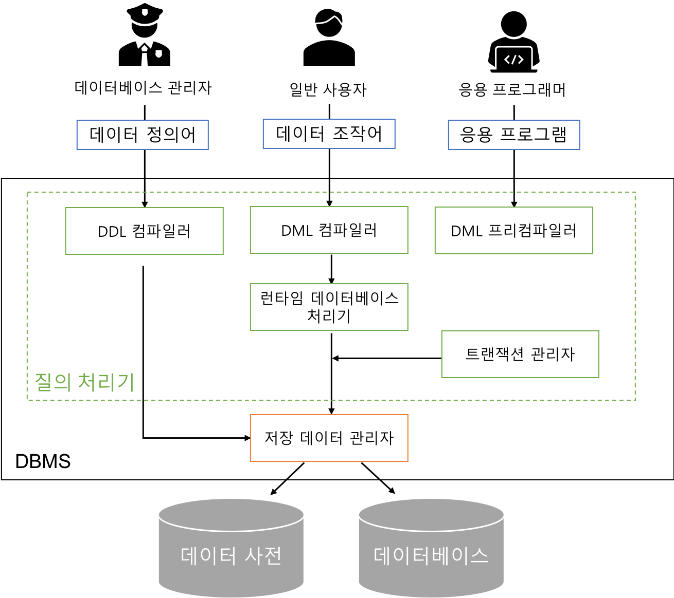 DBMS 에서도 마찬가지로 사용자가 작성한 데이터 언어가 수행될 수 있도록 컴파일러가 변환해주는 것이다.