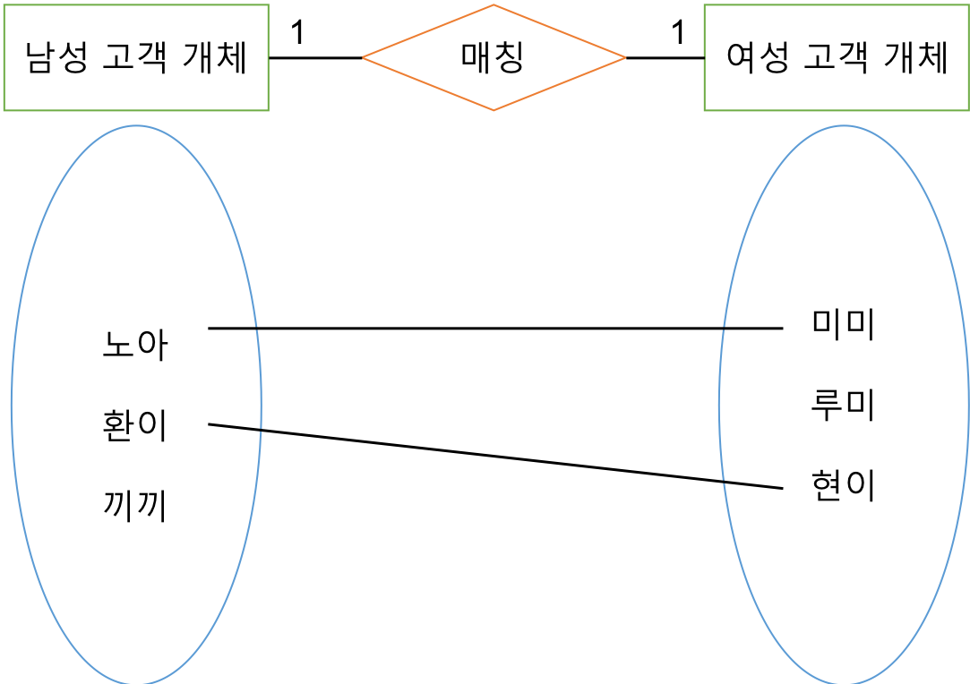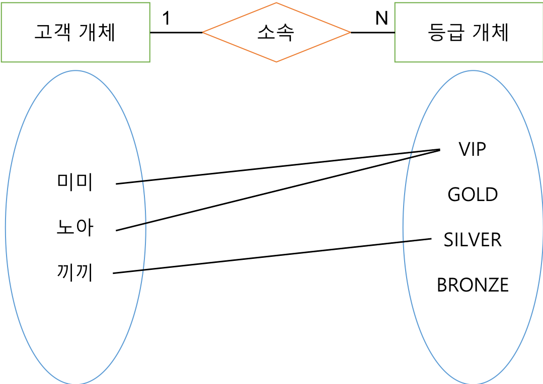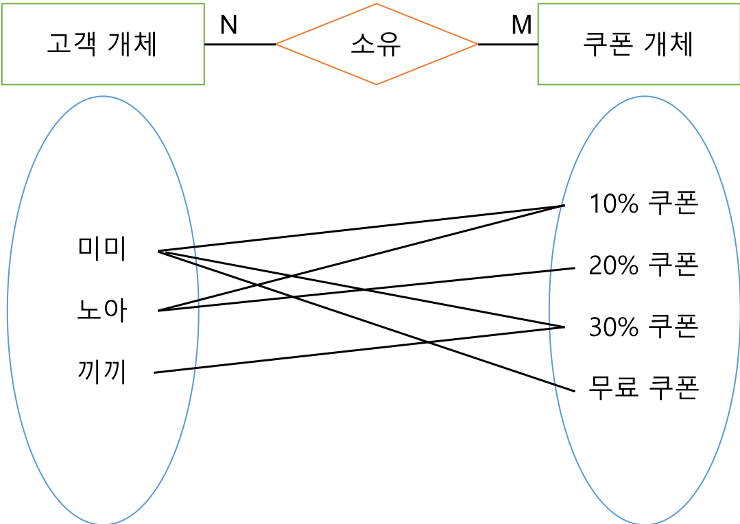 - 관계(relationship) : 관계는 각각의 개체의 인스턴스들이 맺는 관계 유형에 따라 일대일(1:1), 일대다(1:n), 다대다(n:m) 으로 나누어진다.