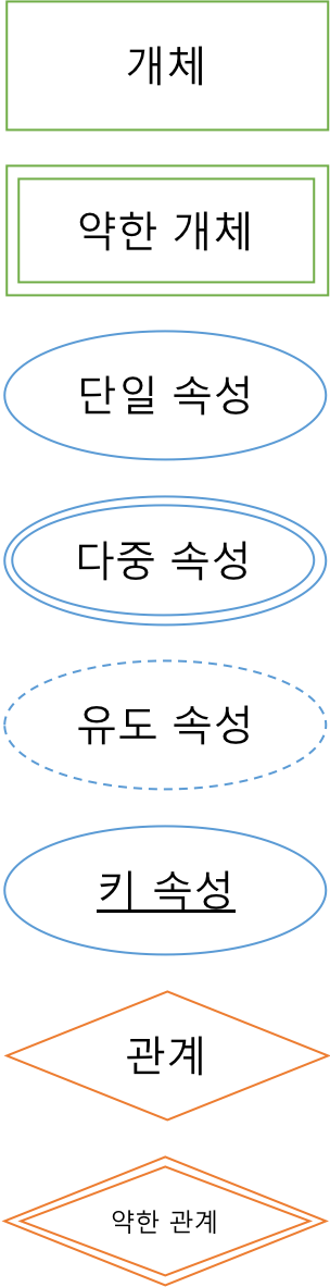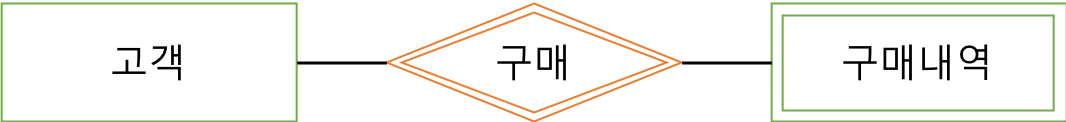 - 약한 개체(weak entity) : 두 개체가 있을 때 독자적으로 존재할 수 없고, 종속되는 개체를 약한 개체라고 한다. 예를들어 고객과 구매내역이라는 개체가 있으면 두 개체는 구매라는 관계로 이어지고, 구매내역은 고객이라는 개체가 없으면 의미가 없는 것이기 때문에 고객 개체에 종속된다. 여기서 고객을 오너개체, 구매내역을 약한 개체라고 부른다. 일반적으로 오너 개체와 약한 개체는 일대다(1:n)의 관계를 가진다. ( 오너 개체와 약한 개체가 맺는 관계는 이중 마름모로 표현한다. )