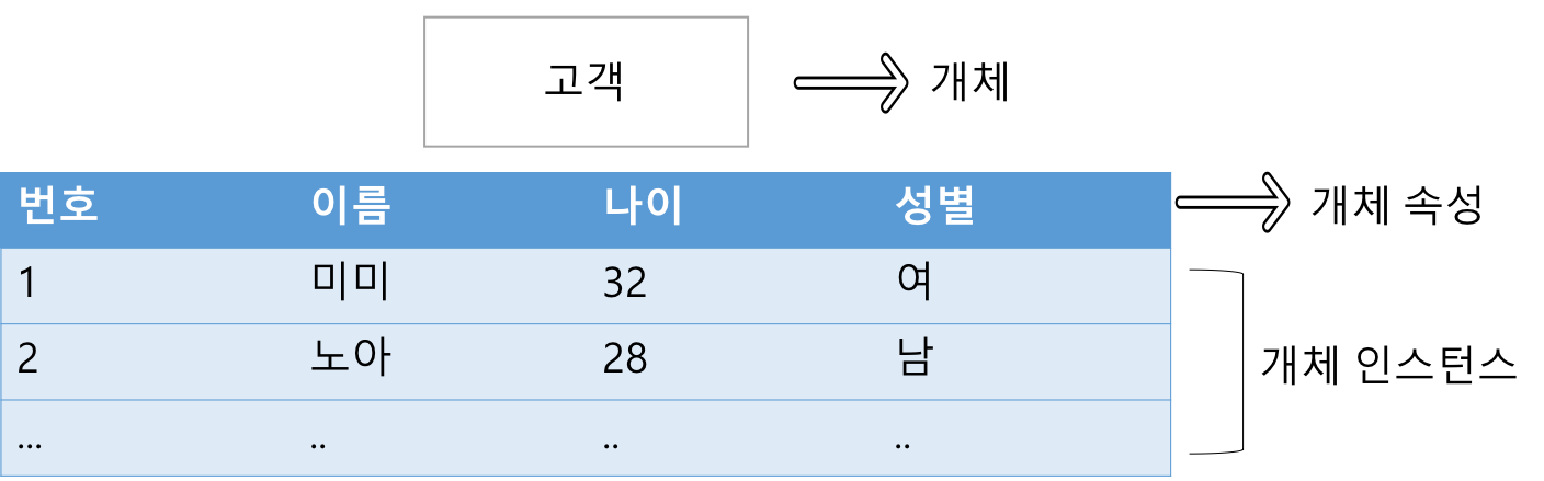 - 개체 (entity) : 독립된 하나의 개념적 존재로 RDBMS 에서는 하나의 테이블이라 생각하면 된다.