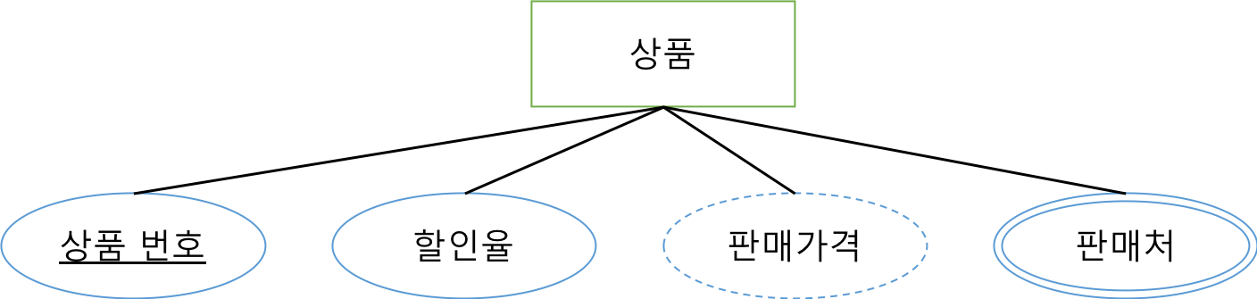 - 속성(attribute) : 속성은 개체가 가지고 있는 고유의 특성이다. 속성들이 모여 하나의 개체가 된다. RDBMS에서는 레코드 부분이라 생각하면 된다. 속성에도 종류가 있는데 아래의 그림과 같이 상품 번호처럼 밑줄 그어진 속성은 키 속성으로 개체의 각 인스턴스를 식별하는 역할을 한다. 할인율 같은 경우는 단일 속성으로 하나의 값을 가지는 일반적인 속성이다. 판매가격 같은 경우는 다른 속성의 값에 따라 값이 유도되어 결정된다고 하여 유도 속성이라 한다. 판매처의 경우 다중 값 속성이라 하여 값이 여러개가 존재할 수 있는 속성이다. 상품마다 판매처는 여러 곳일 수 있기 때문에 다중 값 속성이 되는 것이다.