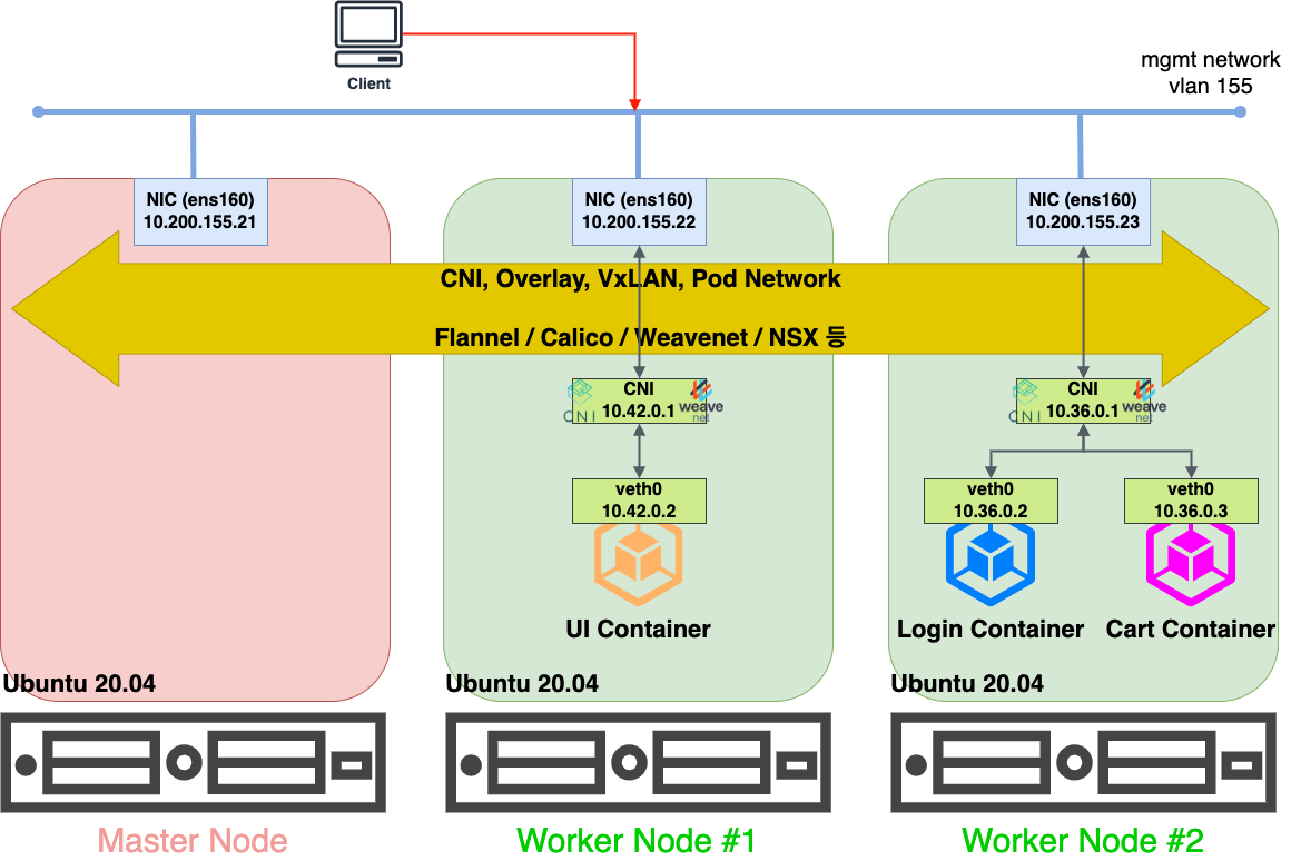위와 같은 멀티 호스트로 구성되어 있는 컨테이너 끼리 통신을 하기 위해서는 CNI가 반드시 설치되어 있어야 합니다.