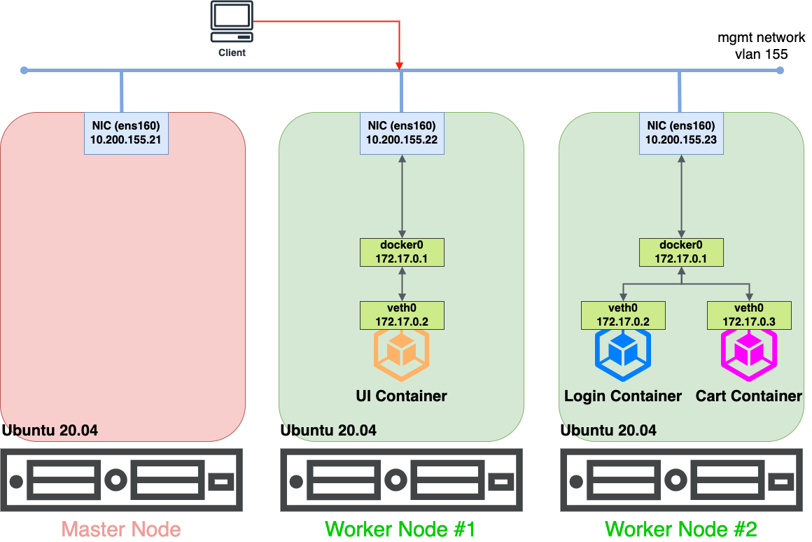 UI 컨테이너(172.17.0.2) 에서 Login 컨테이너(172.17.0.2) 로 통신을 하기 위해 트래픽을 보낸다고 가정합니다. 정상적인 통신 패턴이라면 UI 컨테이너는 veth0 인터페이스를 통해 docker0 라는 브릿지 인터페이스를 타고 NAT처리 되어 worker node #1의 물리 인터페이스인 ens160의 IP(10.200.155.22) 로 나갑니다. 그 후, worker node #2 의 물리 인터페이스인 ens160 (10.200.155.23) 으로 들어와 docker0 브릿지 인터페이스를 통해 Login 컨테이너의 veth0으로 들어옵니다.