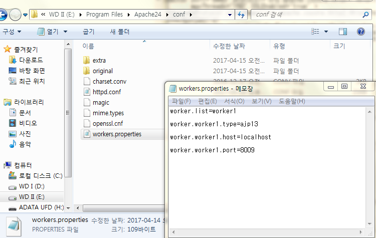 (아파치경로)\conf 폴더 안에 텍스트 파일을 만들고 파일 이름과 확장자를 workers.properties로 설정합니다