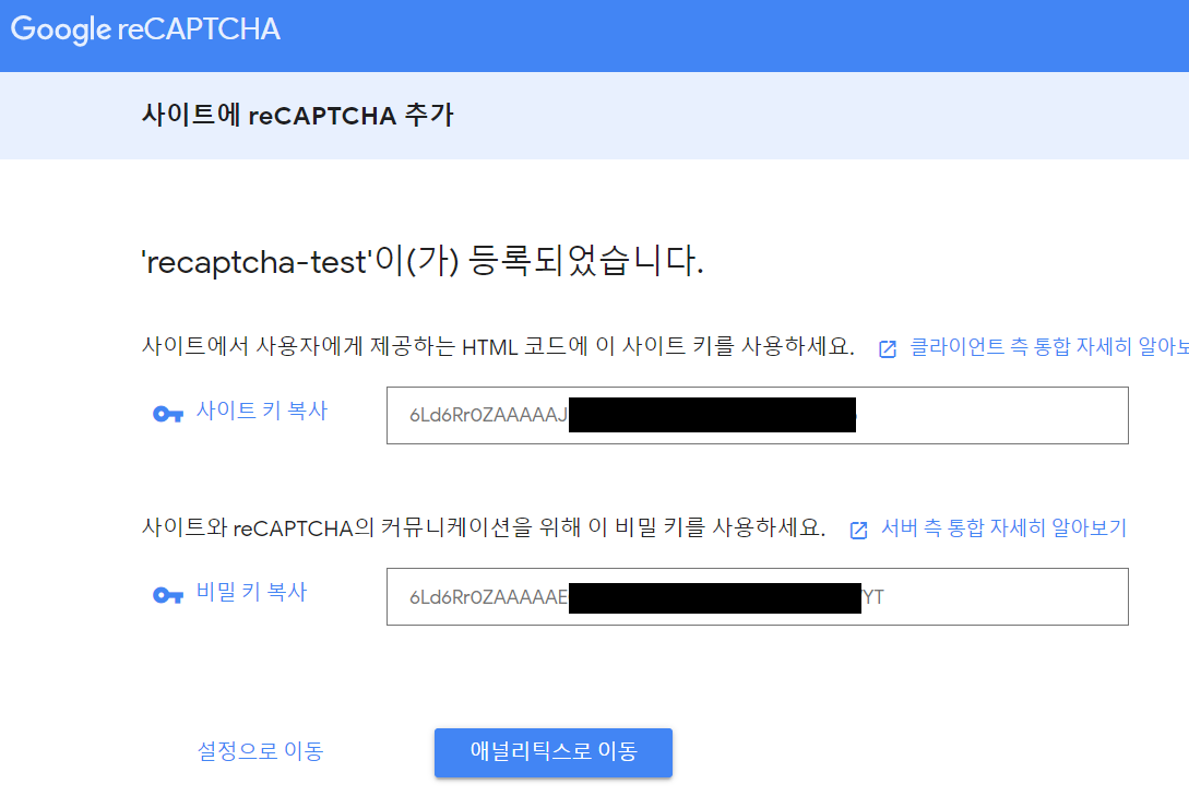 - 생성된 Site Key(사이트키)와 Private Key(비밀키)를 확인합니다.
