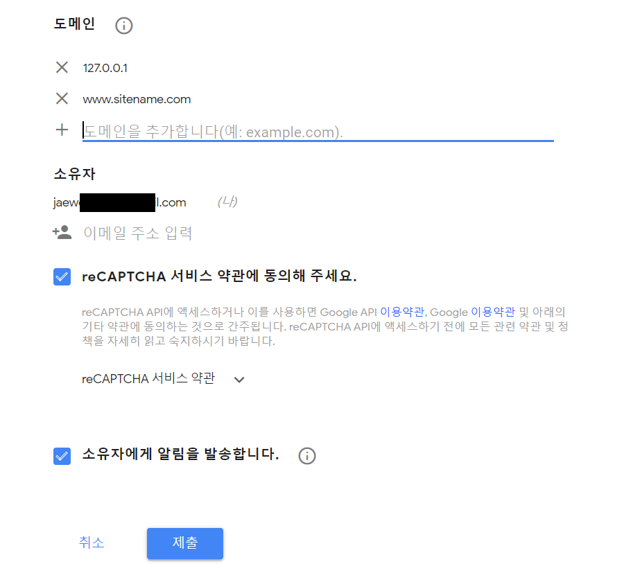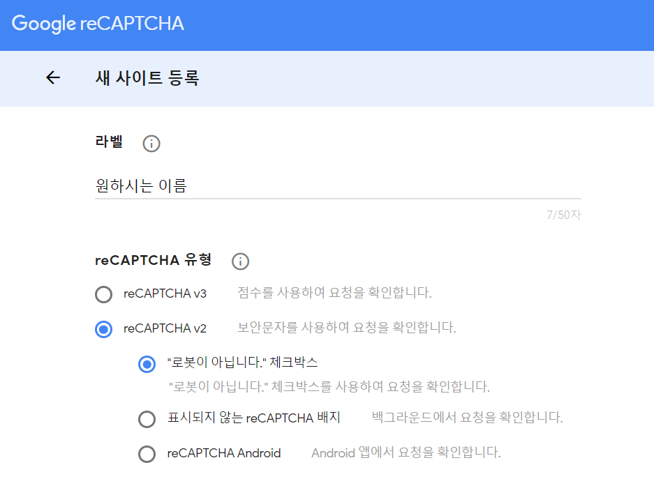 - 정보를 입력하여 사용할 reCAPTCHA를 생성합니다.