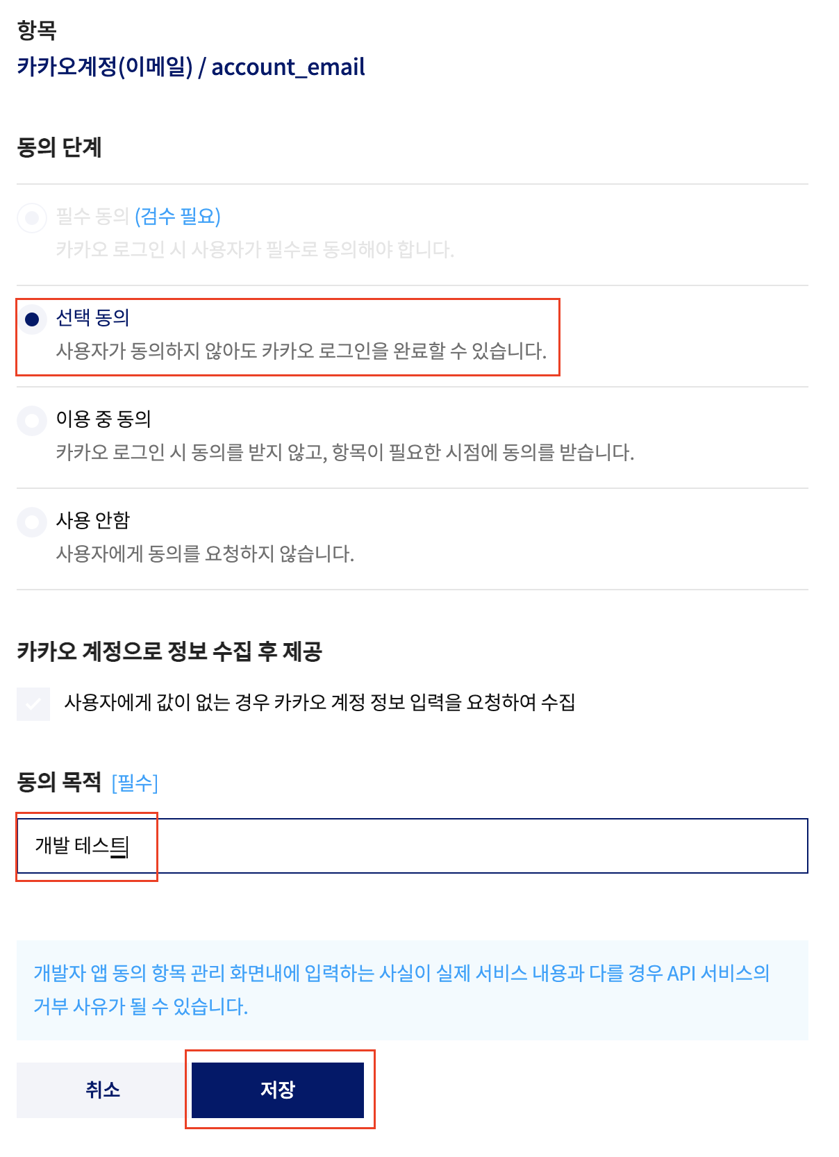 7) 카카오 계정(이메일) 설정 > 선택 동의 체크 > 동의 목적 입력 (개발 테스트) > 저장