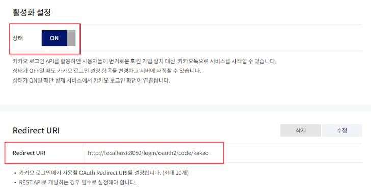 5) 제품 설정 > 카카오 로그인 > 활성화 설정 ON >Redirect URI (http://localhost:8080/oauth2/code/kakao) 등록