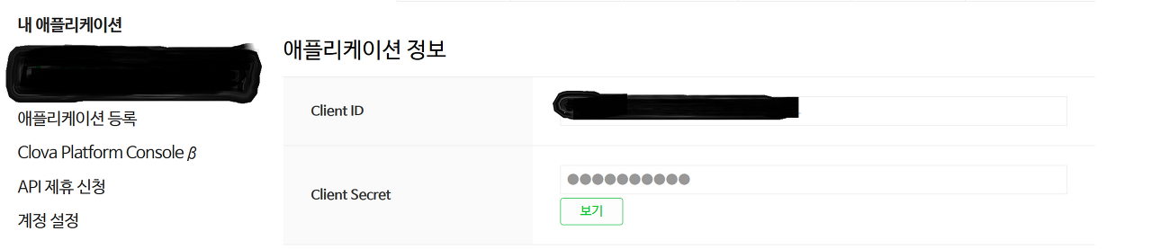 정상적으로 API사용신청이 완료 되었다면 내 애플리케이션(위에서 지은 이름이 아래에 뜬다)항목에서 Client ID 와 Client Secret 정보를 확인 할 수 있습니다.