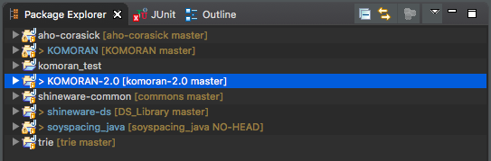Java 를 이용하기 위하여 eclipse 를 이용하였습니다. 자바 및 eclipse 설치는 구글링하면 좋은 블로그들이 많이 검색됩니다. 코모란이 이용하는 commons, ds, aho-corasick 을 eclipse 를 이용하여 jar 파일로 만듭니다.