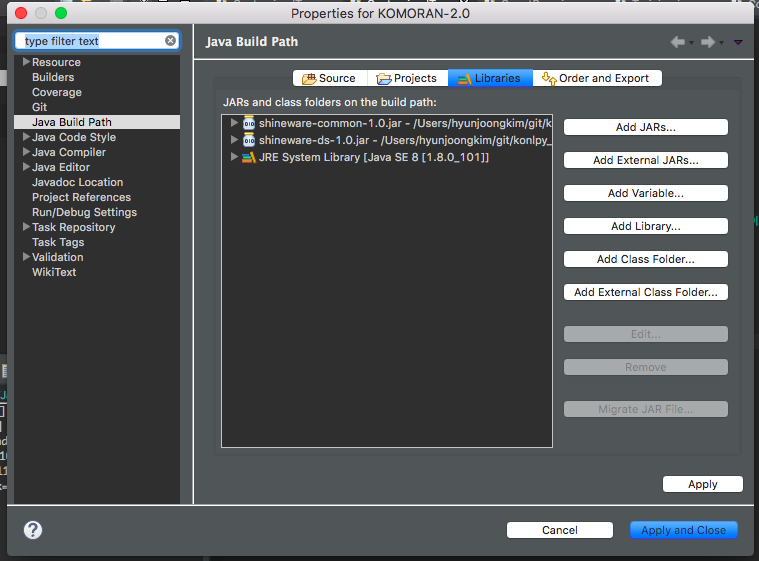 위와 동일한 방법으로 git clone 한 코모란 2.x 의 폴더를 Java project 에 추가합니다. 이제 우리가 만든 jar 파일을 추가합니다. Package Explorer 의 코모란 폴더를 우클릭 한 뒤 Properties 를 누릅니다. 왼쪽의 Java Build Path 를 누른 뒤, 우측 상단의 Libraries 를 누릅니다.